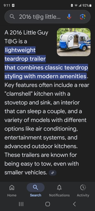 The 2016 Little Guy T@G teardrop trailer has several configurations, but a common model, the T@G XL Max, has specs including a dry weight of around 1,150-1,388 lbs, a length of about 13'7", and can sleep two people. Key features include a 2-inch ball mount hitch, 30-amp electrical service, and amenities like a kitchen area, and heating/cooling options. The T@G Basic is lighter, at about 995 lbs, with a slightly shorter length, and the T@G Max Basehas a dry weight of 1060 lbs and is about 163 inches long.
